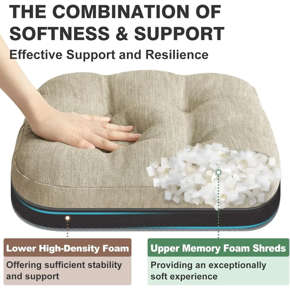 This dining chair cushion set of 6 offers a dual-layer foam design, combining premium soft shredded memory foam for the top layer with a solid high-density foam base for effective support, ensuring a comfortable seating experience. Made from high-quality polyester fabric, these cushions are durable, anti-pilling, fade-resistant, and snag-free, featuring a unique linear texture that adds elegance to your home decor. The non-slip gel particles on the bottom grip the chair surface without causing damage, and the included straps secure the cushions to the chair back. With dimensions of 16.5 inches in length, 16.5 inches in width, and 3.5 inches in thickness, these versatile memory foam chair pads fit most chair sizes and are suitable for various settings such as dining rooms, living rooms, bedrooms, and offices.