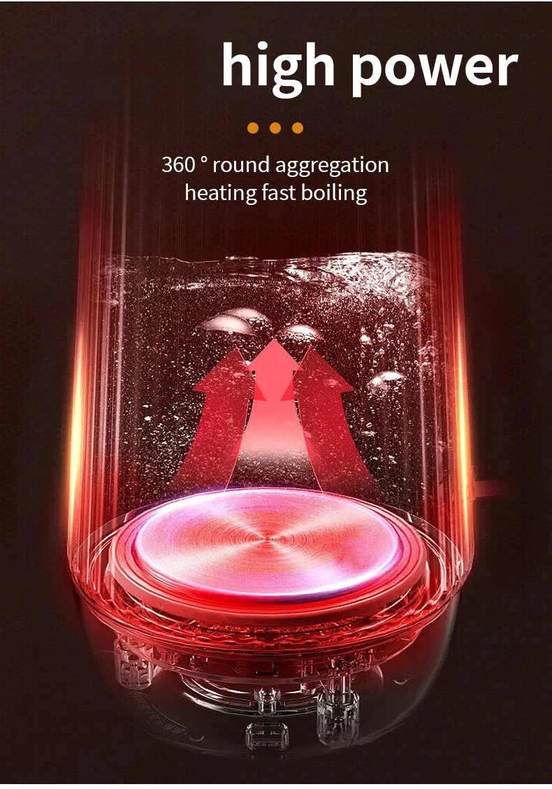Safety Features - Moreover, this kettle water boiler featured with boil-dry protection and auto shut-off, will automatically switch off if there isn't enough water inside or when the water reaches the boiling point. This travel kettle can be rotated 360° effortlessly when you want to place it to the base.