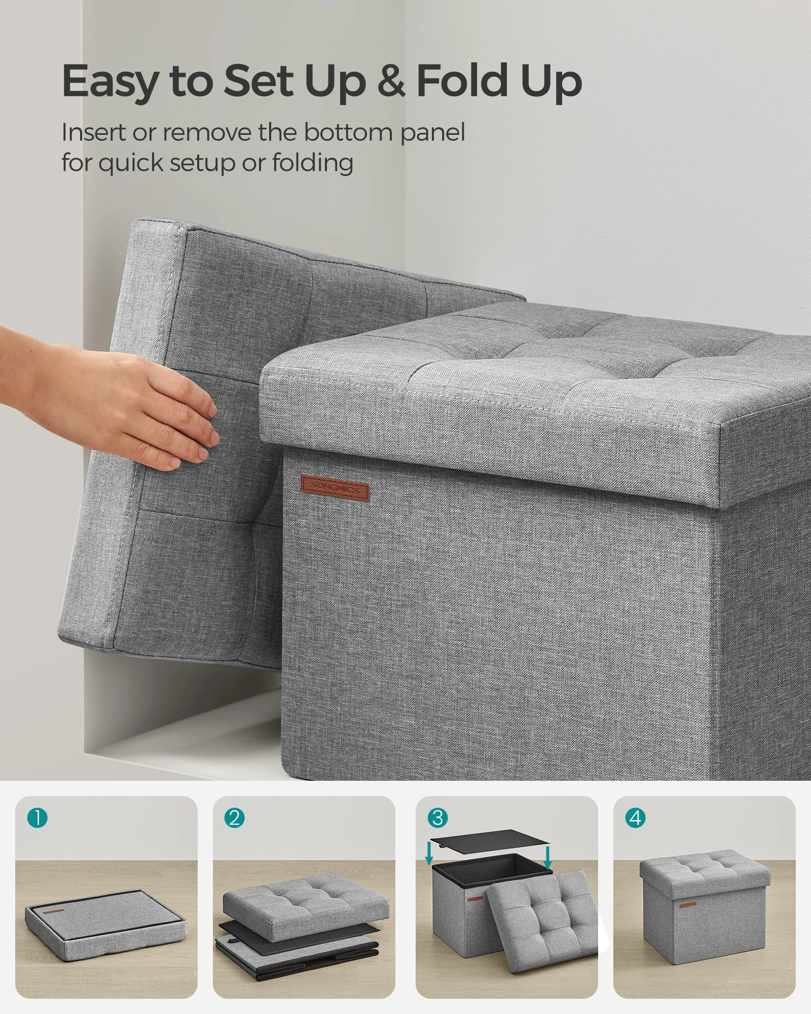 【EASY TO SET UP & FOLD UP】Set up this ottoman with storage in seconds by inserting the bottom panel. Easily fold and store it under the bed or in a closet when not in use
