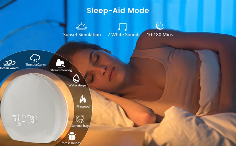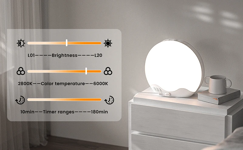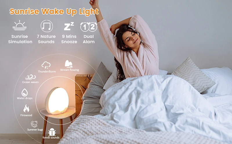 1 , The sunrise simulated wake-up light will gradually wake you up in the closest approximation of a natural sunrise, from soft morning reds to oranges until your room is filled with bright white light, while the brightness slowly goes from 1% to 100%. Wake up naturally every morning and feel refreshed.