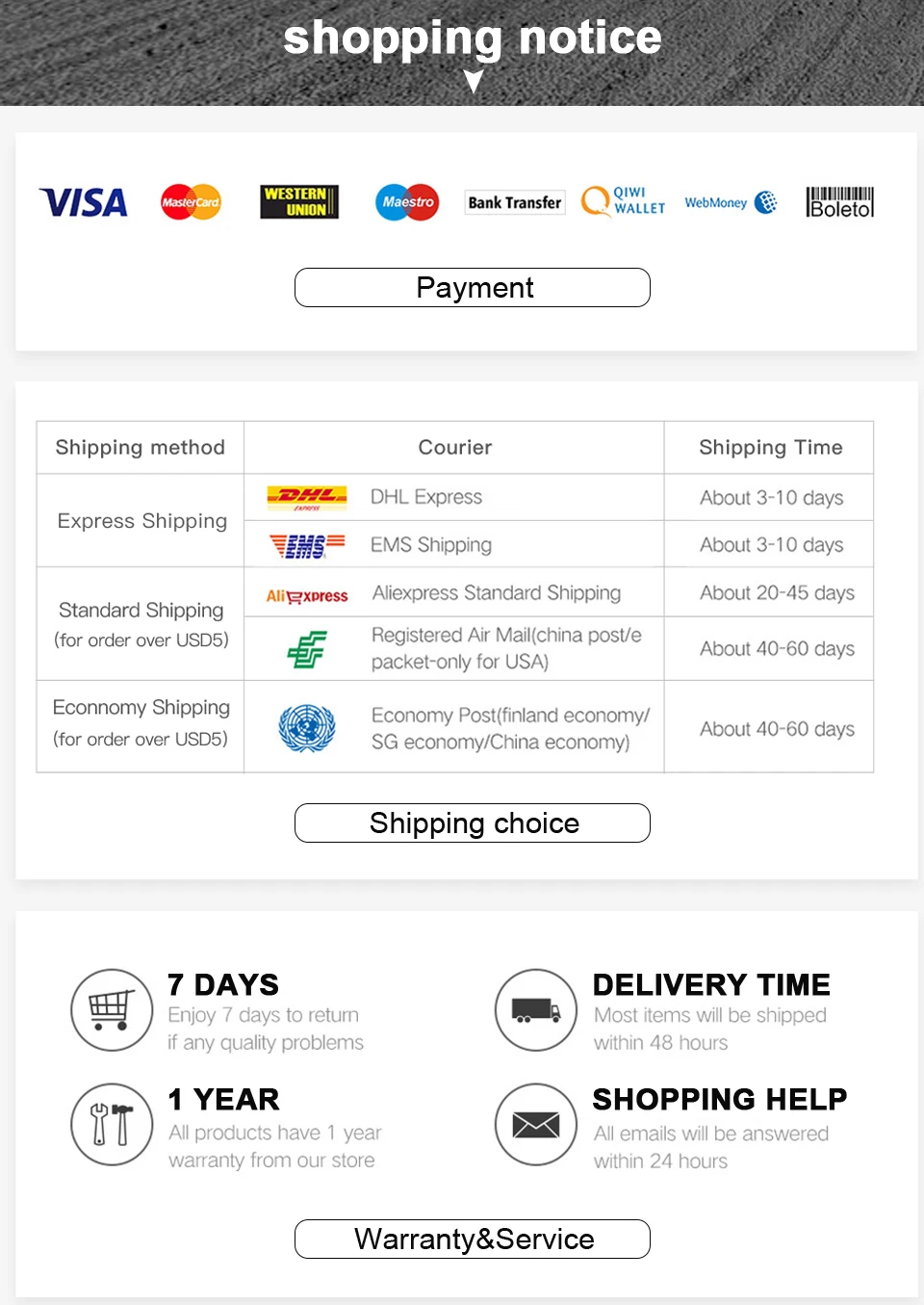 Please note that processing time (3–5 business days) is separate from shipping time and should be added to the total delivery time. During busy periods such as holidays or promotions, delivery may take longer than expected.