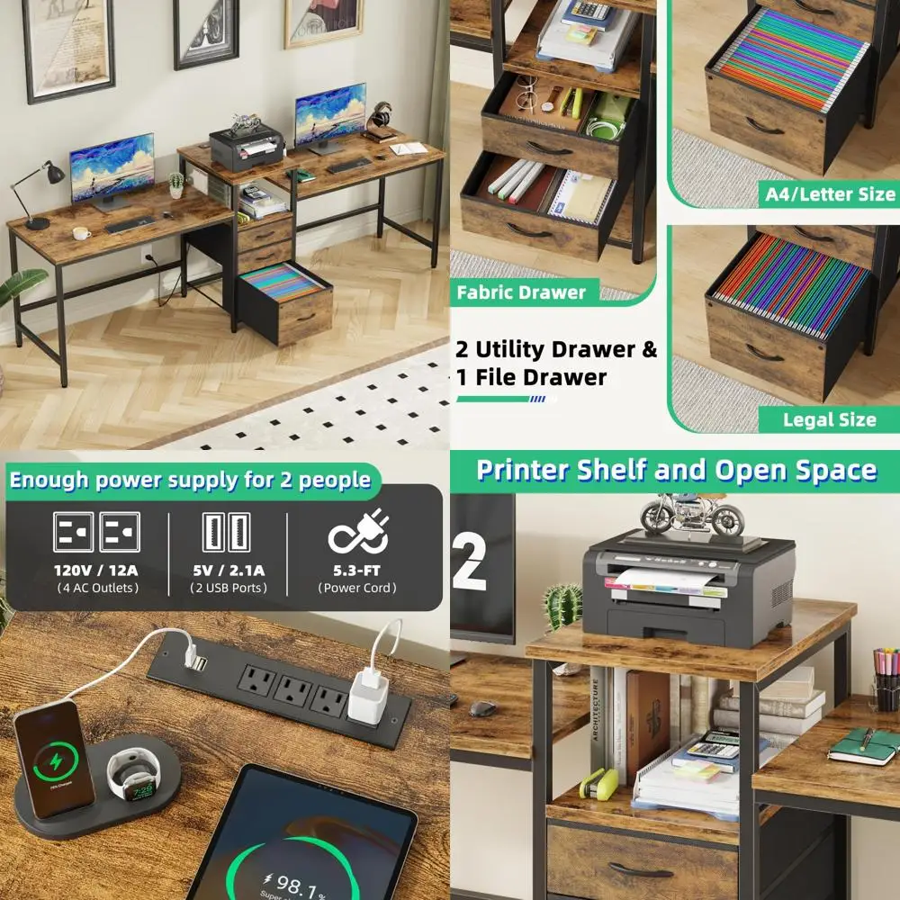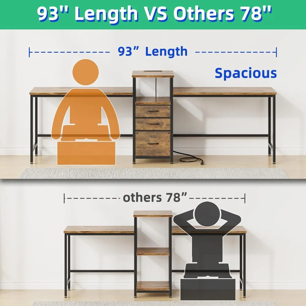 This product features an extra-long 93-inch desk designed for a spacious and comfortable office or study environment, perfect for two people to work without feeling crowded. Compared to other double desks that are only 78 inches, this one offers ample space. It includes three large drawers for storage, with two being regular storage drawers and one specifically designed for filing, capable of holding A4/Letter/Legal-sized documents. The desk is equipped with four AC outlets and two USB ports, providing convenient charging for various devices such as computers, laptops, printers, speakers, phones, and tablets. Additionally, there is a dedicated printer space in the center of the desk, which helps to optimize the workspace layout. Assembly is straightforward with detailed instructions and necessary accessories included. The desk is tested to support over 310 lbs and comes with a 12-month warranty and 24-hour customer service support.