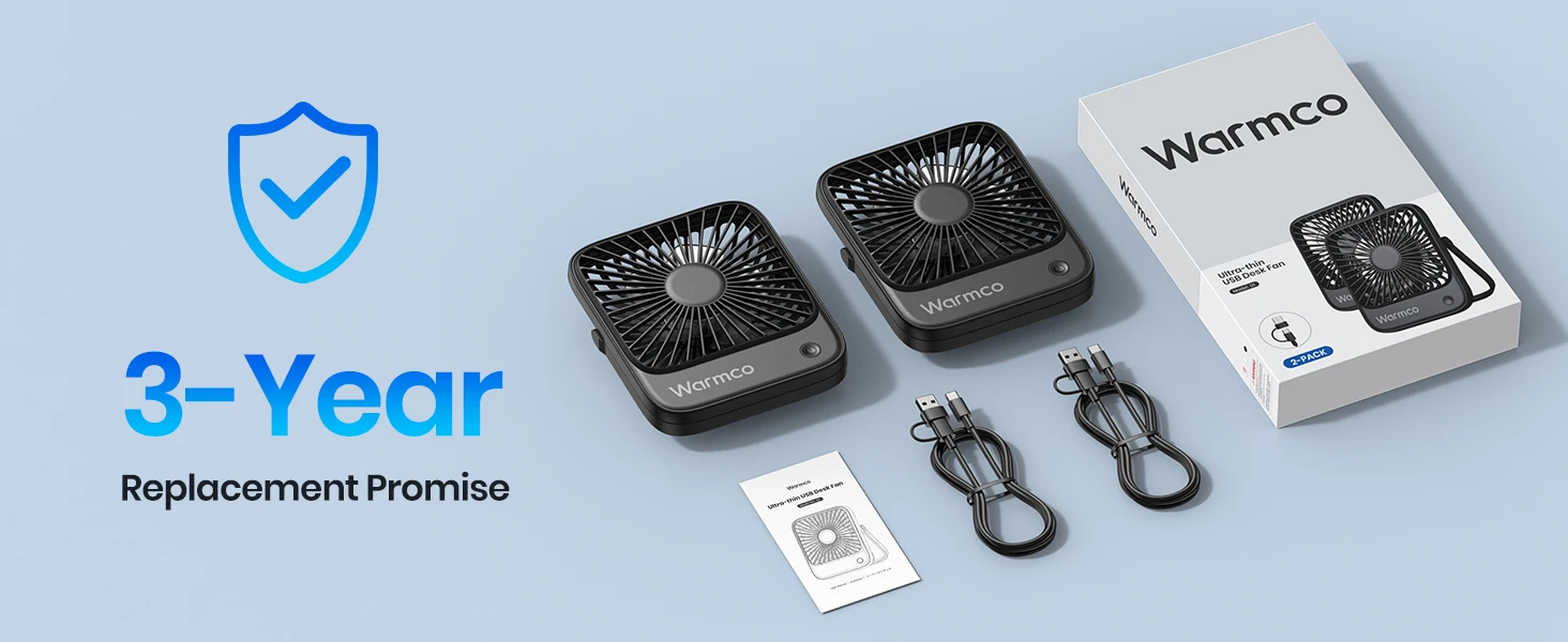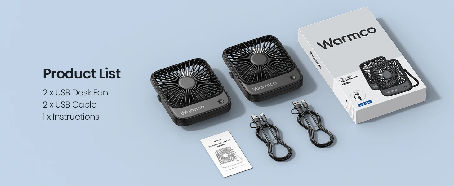USB Desk Fan 2-Pack:Each package includes two fans, a manual, and two Type C charging cables, you can share with a friend or keep one at home and one at the office. Stay cool wherever you are