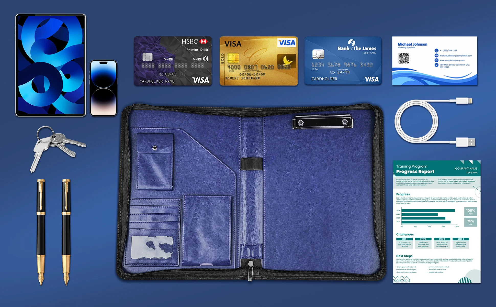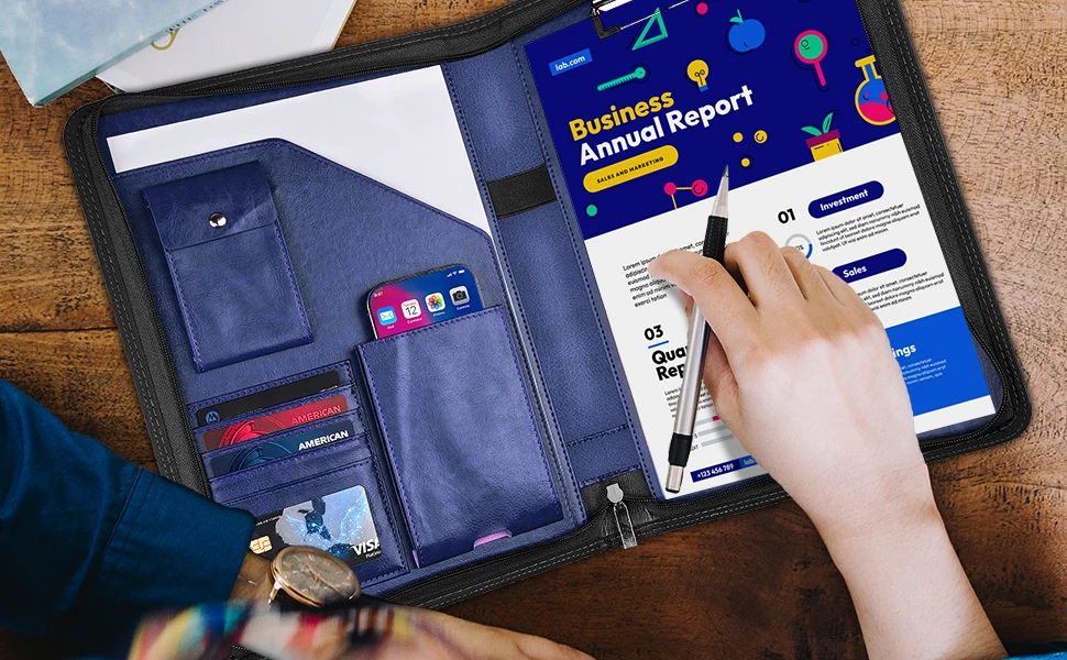 Multiple Compartments: Features 1 A4 clipboard 1 document sleeve 1 phone pocket 5 card slots with ID window 1 gadget pocket with fastener and 1 pen holder Keeps essentials organized and protects documents from spills